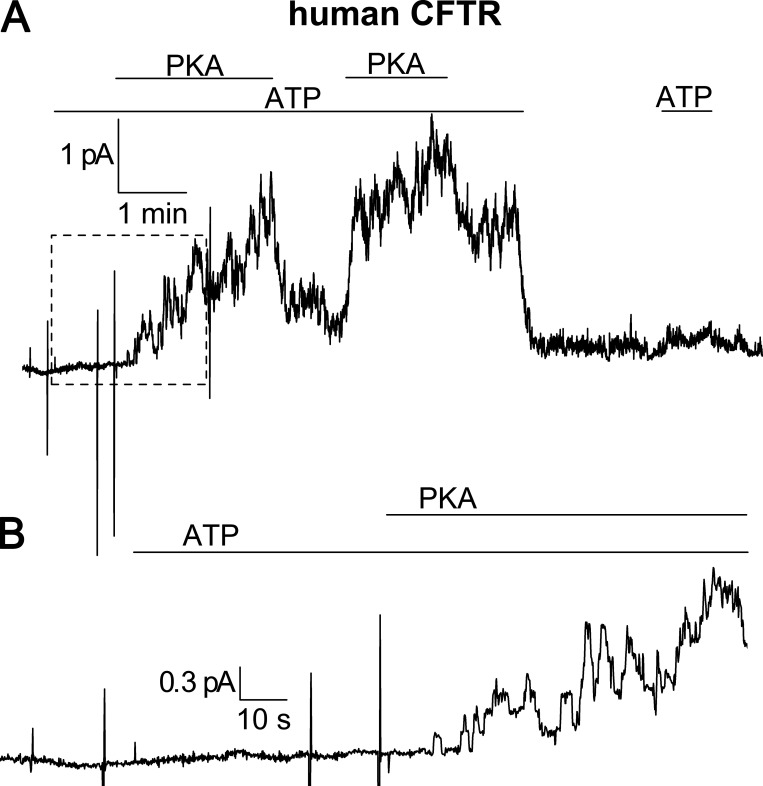 Figure S1. CFTR recording in a giant patch demonstrating PKA activity. As a positive control for the patch-clamp experiments on α1β1FXYD1, we tested the ability of the same preparation of PKA to activate CFTR, typically a few days after the α1β1FXYD1 recordings. (A) Current recording at 0 mV from a large, inside-out patch excised from an oocyte 1 d after injection with human CFTR cRNA. Endogenous Na/K pumps were inhibited by incubating the oocyte in 10 µM ouabain before the experiment. The pipette contained the same external NMDG+ solution with 5 mM K+ as other patch clamp experiments, and the inside of the patch was perfused with 25 mM Na+ internal solution ([Na+] + [K+] = 140 mM). Under these experimental conditions (â¼150 mM external Clâ and â¼30 mM internal Clâ, 0 mV), CFTR currents are outward. Application of 4 mM ATP alone to the inside of the patch produced no change in the baseline current, but simultaneous application of ATP with 10 µM PKA catalytic subunit induced an outward current that returned to baseline upon their removal. The large, vertical current deflections before the initial PKA application are 25-ms I-V pulses. (B) Enlargement of the current trace enclosed by the dashed box in A. Single-channel openings are visible â¼10 s after application of ATP and PKA. |
