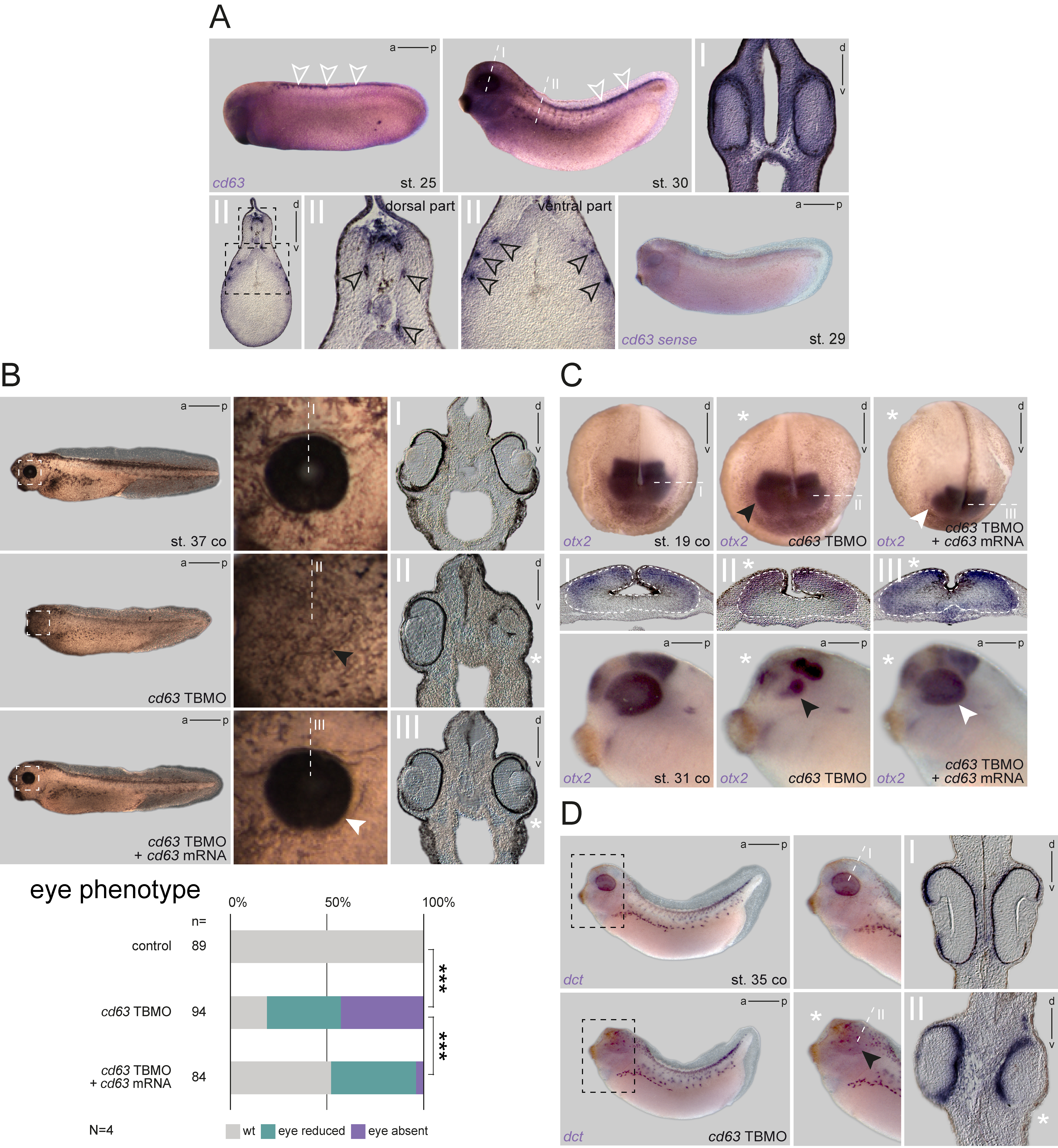 Figure 1. Loss of Cd63 in the neural ectoderm caused defects in eye morphogenesis: A Expression pattern of cd63 during tailbud stages. Enrichment of transcripts in the TNC of st. 25 (white arrowheads). At st. 30, cd63 was additionally detected in eyes and cement gland. Transversal sections highlighted signals in the eyes, headmesenchyme, brain, premigratory TNC, dorsal finmesenchyme, medially and laterally migrating TNC cells (black arrowheads). cd63 sense control specimen of st. 29 did not show any signal. B Knockdown of cd63 in one dorsal animal blastomere resulted in impaired eye development, which was rescued by co-injection of cd63 mRNA. Sections illustrated normal eye structures in control and rescue specimen, whereas morphant embryos depicted disturbed optic cup formation on the injected side. Quantification of eye phenotypes illustrates significance of the effect. C Unilateral loss of cd63 in the eye field lineage revealed altered expression pattern of otx2 in neurula and later tailbud stages. At neurulation, otx2 showed no reduction in intensity but indicated alterations of the targeted eye vesicle (black arrowhead). Sections revealed defects in medialforebrain closure and lateral optic vesicle formation. In tailbud stages, loss of cd63 resulted in partial reduction of eye tissues (black arrowhead) compared to matching controls. Both effects were reduced by co-injection of cd63 mRNA (white arrowheads). D cd63 TBMO injection did not block TNC migration or dct expression in eyes or melanophores of unilateral morphants. Sections revealed massively impaired formation of eyetissue (black arrowhead) compared to WT eyes of controls. Asterisks mark the injected side. a, anterior; co, control; d, dorsal; p, posterior; TBMO, translation blocking Morpholino oligomer; TNC, trunk neural crest; st., stage; v, ventral; wt, wild type.