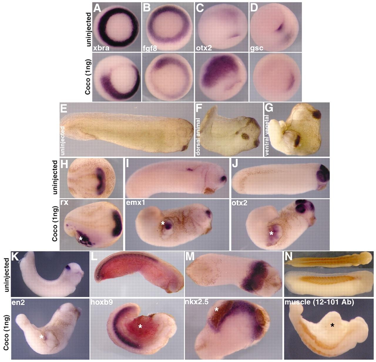 Patterning of the pre-gastrula embryo and subsequent neural induction post-gastrulation are very complex and intricate processes of which little, until recently, has been understood. The earliest decision in neural development, the choice between epidermal or neural fates, is regulated by bone morphogenetic protein (BMP) signaling within the ectoderm. Inhibition of BMP signaling is sufficient for neural induction. Many secreted BMP inhibitors are expressed exclusively within the organizer of the Xenopus gastrula embryo and therefore are predicted to act as bona fide endogenous neural inducers. Other cell-autonomous inhibitors of the BMP pathway are more widely expressed, such as the inhibitory Smads, Smad6 and Smad7. In this report we describe the biological and biochemical characterization of 51-B6, a novel member of Cerberus/Dan family of secreted BMP inhibitors, which we identified in a screen for Smad7-induced genes. This gene is expressed maternally in an animal to vegetal gradient, and its expression levels decline rapidly following gastrulation. In contrast to known BMP inhibitors, 51-B6 is broadly expressed in the ectoderm until the end of gastrulation. The timing, pattern of expression, and activities of this gene makes it unique when compared to other BMP/TGFbeta/Wnt secreted inhibitors which are expressed only zygotically and maintained post-gastrulation. We propose that a function of 51-B6 is to block BMP and TGFbeta signals in the ectoderm in order to regulate cell fate specification and competence prior to the onset of neural induction. In addition, we demonstrate that 51-B6 can act as a neural inducer and induce ectopic head-like structures in neurula staged embryos. Because of this embryological activity, we have renamed this clone Coco, after the Spanish word meaning head.