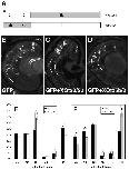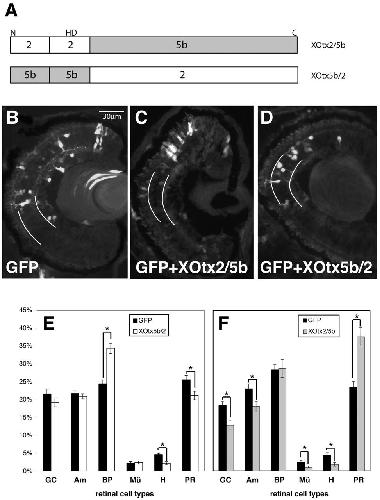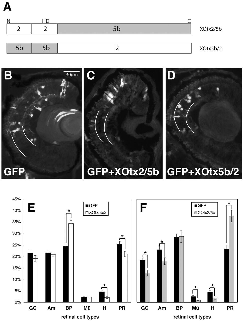 Fig. 6. Swapped domain experiments suggest that the C terminus of XOtx2 or XOtx5b is necessary in determining bipolar or photoreceptor cell fate, respectively. (A) Schematic of constructs used in lipofection experiments. N, N terminus; HD, homeodomain; C, C terminus; 2, XOtx2; 5b, XOtx5b. (B-D) Stage 41 lipofected retinas were sagittally cryostat sectioned (10 μm) after transfection with GFP and pCS2+ vector, XOtx2/5b or XOtx5b/2 during early stages of eye formation. Lines are drawn over inner and outer plexiform layers to define the laminated retina (see Fig. 4). (B) GFP lipofected retina shows all retinal cell types. (C) GFP and XOtx2/5b lipofected retinas have an increase of photoreceptor cells as do XOtx5b lipofected retinas. (D) GFP and XOtx5b/2 lipofected retinas also have an increase of bipolar cells. (E-F) Quantitative analysis of retinas lipofected with GFP and pCS2+ compared to retinas lipofected with (E) XOtx5b/2 and GFP (pCS2+, n=24; XOtx5b/2, n=30) or (F) GFP and XOtx2/5b (pCS2+, n=26; XOtx2/5b, n=23). The ratio of retinal cells per total retina was calculated for each retina and then the ratios averaged for the total retinas counted (n). The error bars, s.e.m.; Pâ¤0.05 (Student's t-test). |