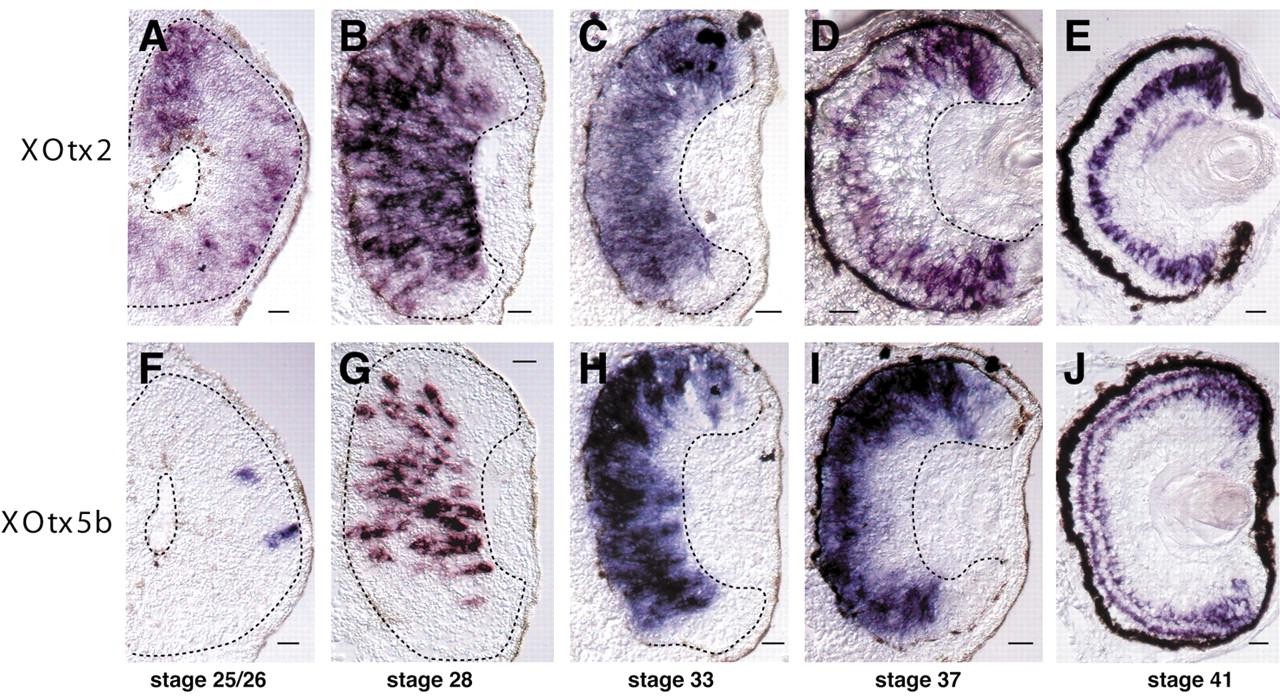 Fig. 2. Expression of XOtx5b and XOtx2 in retinal sections. Section in situ hybridisation of XOtx2 (A-E) and XOtx5b (F-J) in the Xenopus retina at stages 25/26 (A,F), 28 (B,G), 33 (C,H), 37 (D,I) and 41 (E,J). (A,F) XOtx2 (A) is expressed throughout the presumptive retinal pigment epithelium and retina while XOtx5b (F) expression is only in the central retina. (B,G) As retinal invagination progresses, expression of both XOtx2 (B) and XOtx5b (G) appear in the central retina. (C,H) Expression of XOtx2 (C) and XOtx5b (H) is identical. Transcripts from either of these genes are found throughout the developing retina except in the peripheral dorsal and ventral regions. (D,I) The central retinal expression of these two transcripts is reduced to particular layers. XOtx2 (D) is expressed in the outer edge of the inner nuclear layer (INL). XOtx5b (I) is also found in the outer edge of the INL and also in the outer nuclear layer (ONL). The peripheral retina still expresses these transcripts in the ganglion cell layer. (E,J) When the retina is mature, XOtx5b (J) is found in both the photoreceptor layer and the outer cells of the INL. Like XOtx2 (E), it is also found in the edge of the CMZ. XOtx2 is also expressed in cells at the outer edge of the INL. Bars: 20 μm; dashed lines indicate the extent of developing neural retina in A-D,F-I. |