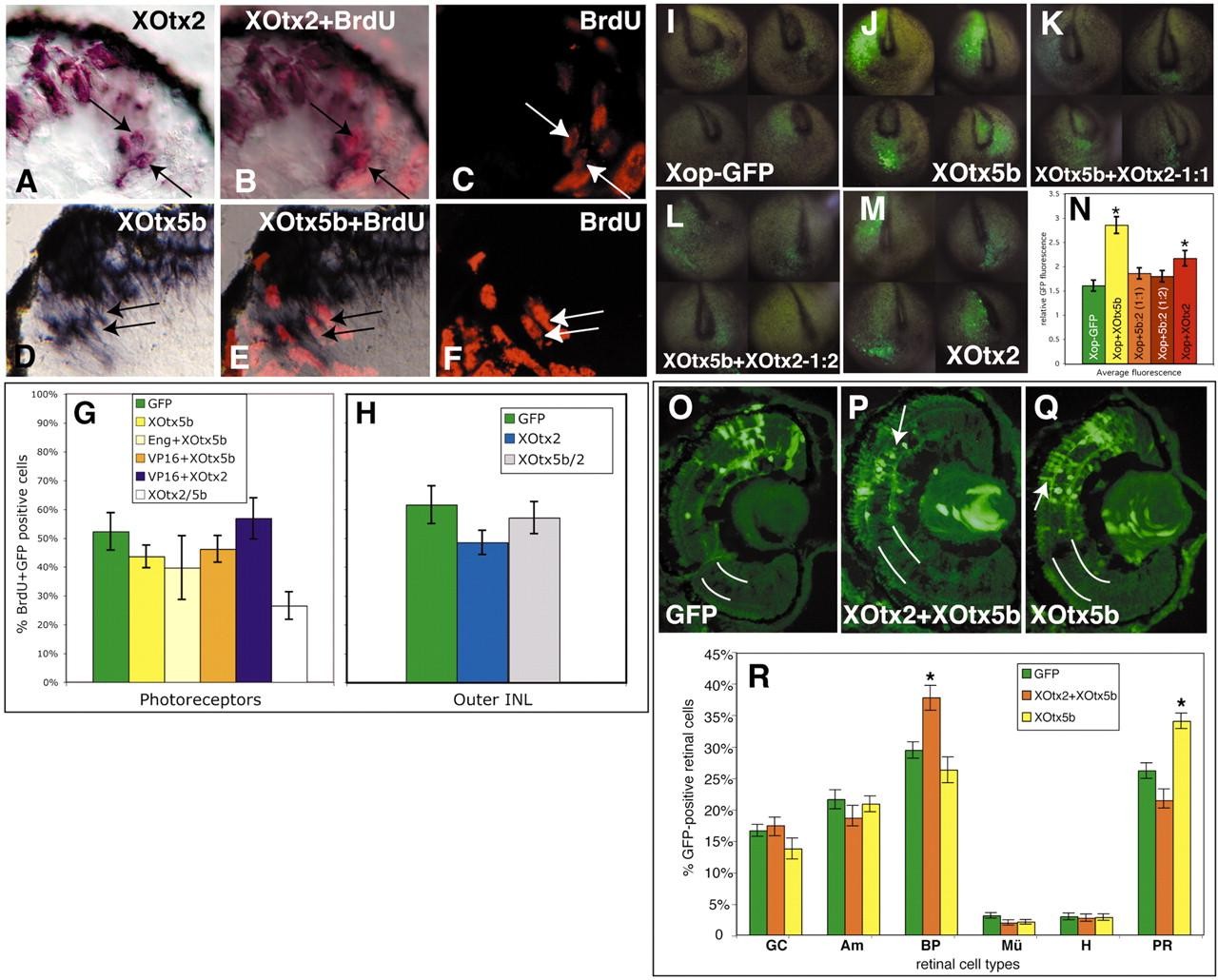 Fig. 7. XOtx2 and XOtx5b are expressed in proliferating cells but do not stimulate proliferation. (A-F) A close-up of stage 41 retinal cryostat sections (10 μm) showing the ciliary marginal zone of embryos injected with BrdU and fixed 30 minutes later. Arrows in A-C and D-F point to the same cells. (A) A section stained for XOtx2 RNA shows labelled cells (arrows). (C) This section is stained with a BrdU antibody and is viewed under fluorescence. (B) Merged images of A and C (50% transparency). The same experiment is shown for XOtx5b in D-F. (G-H) The total number GFP-positive and BrdU+GFP-positive retinal cells were counted in five retinas lipofected with GFP and the vector alone (n=403), XOtx5b (n=355), EngR+XOtx5b (XOtx5bN+HD-EngR; n=317), VP16+XOtx5b (XOtx5b-VP16; n=384), VP16+XOtx2 (XOtx2-VP16; n=322) and XOTx2/5b (n=353), XOtx2 (n=418), or XOtx5b/2 (n=413). The percentage of BrdU-positive cells was calculated. None of the constructs tested gave an increase in proliferation of photoreceptor cells (G) or cells found in the outer edge of the inner nuclear layer (H). This analysis was done using a Student's t-test. n=the total number of cells counted. (I-R) XOtx2 modulates XOtx5b activity. (I-M) Embryos at stage 18 visualised under fluorescent light that have been injected on one side with the Xenopus opsin promoter fused to (I) GFP (Xop) DNA, β-gal RNA (200 pg) and (J) 50 pg XOtx5b RNA (XOtx5b); (K) 25 pg XOtx5b and 25 pg XOtx2 (XOtx5b+XOtx2 1:1); (L) 17 pg XOtx5b and 33 pg XOtx2 (XOtx5b+XOtx2 1:2); (M) 50 pg XOtx2 (XOtx2). (N) Embryos from each set of injections [Xop (n=35); XOtx5b (n=37); XOtx5b+XOtx2 1:1 (n=28); XOtx5b+XOtx2 1:2 (n=29); XOtx2 (n=31)] were individually photographed under fluorescence and the fluorescence on both sides of the embryo was measured. The ratio of fluorescence on the injected versus uninjected side was calculated (relative GFP fluorescence) and an average for all the embryos from that set was made. Significant difference from the Xop-GFP control set using a Student's t-test was found for both the XOtx5b (P<0.001) and XOtx2 set (P<0.001). XOtx5b and XOtx2 together with Xop did not activate the Xop construct, suggesting that XOtx2 modulates the ability of XOtx5b to activate opsin. (O-Q) Sagittal section of stage 41 embryos lipofected with either GFP and pCS2+ vector (O), GFP, XOtx2 and XOtx5b (P), or GFP and XOtx5b (Q). Arrows point to an increase in bipolar cells in P and an increase in photoreceptors in Q. (R) Graph showing the percentage of GFP-positive retinal cells in retinas lipofected with GFP and the vector alone (n=1255); GFP, XOtx2 and XOtx5b (n=995); and GFP and XOtx5b (n=1188). Asterisks: P<0.01 as determined by a Student's t-test; n, number of GFP-positive retinal cells counted; GC, ganglion; Am, amacrine; BP, bipolar; Mü, Müller; H, horizontal, and PR, photoreceptor cells. Error bars represent s.e.m. |