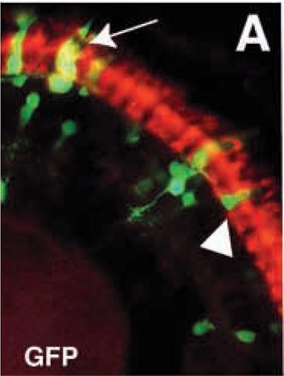calb1 ( calbindin ) gene expression in Xenopus laevis embryo via in immunohistohemistry, NF stage 41. Cryostat sections (10 mm) of retinas lipofected with GFP and the pCS2+ vector then stained with an anti-cone photoreceptor antibody (calbindin in red). Arrowheads indicate cells that fluoresce with GFP alone (green) and arrows indicate cells expressing both GFP and calbindin (yellow). |