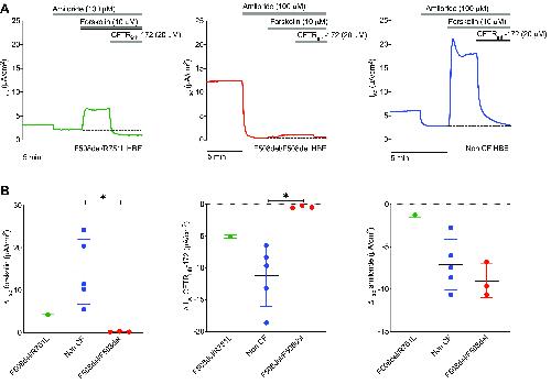Figure 1. Short-circuit current responses in F508del/R751L, non-cystic fibrosis (CF), and F508del/F508del human bronchial epithelial (HBE) cultures. A: short-circuit current (Isc) responses to amiloride (100 µM), forskolin (10 µM), and CF transmembrane conductance regulator (CFTR)inh-172 (20 µM) were measured using Ussing chamber experiments in F508del/R751L, non-CF, and F508del/F508del HBEs. Representative traces shown from n = 1 donor in each graph. Lines indicate reagent addition to the apical Ussing chamber, which remained present in solution throughout the recordings. Functional CFTR is represented by a positive Isc deflection arising from net anion basolateral-apical secretion following forskolin addition. Dashed line indicates the baseline Isc prior to forskolin addition. CFTR is inhibited by the addition of CFTRinh-172. Amiloride addition inhibits epithelial sodium channel (ENaC)-mediated sodium absorption, resulting in a downward Isc deflection. B: comparative assessment of Isc showed greater responses to forskolin and CFTRinh-172 in non-CF compared with F508del/R751L HBEs. F508del/R751L HBEs demonstrated the smallest response to amiloride. Data are presented as mean (SD) responses for each donor and analyzed using unpaired t test. F508del/R751L HBEs were not included in statistical comparisons; n = 1 F508del/R751L donor, n = 5 non-CF donors, and n = 3 F508del/F508del donors for each graph. Minimum 3 culture inserts used from each donor. *P < 0.05.