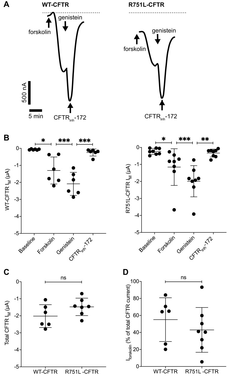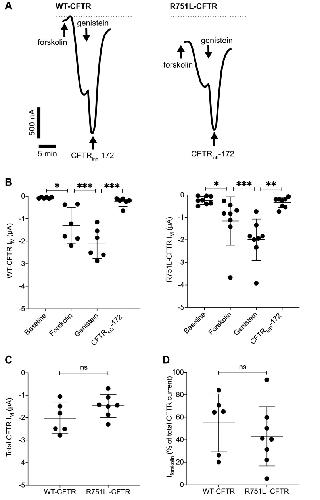 Figure 2. Transmembrane currents in wild-type (WT) and R751L-CFTR-expressing Xenopus oocytes. A: transmembrane current (IM) responses to forskolin (5 µM), genistein (40 µM), and cystic fibrosis transmembrane conductance regulator (CFTR)inh-172 (10 µM) were measured in Xenopus oocytes expressing WT and R751L-CFTR, with representative traces shown from n = 1 oocyte. Experiments were performed at room temperature. Arrows indicate reagent addition to the bathing solutions, with evidence of a time lag between reagent addition and response. Downward deflections in IM are indicative of anion efflux. Dashed lines indicate zero current for representative recordings. B: IM measurement in oocytes expressing WT and R751L-CFTR demonstrated forskolin and genistein-induced IM, which were inhibited by CFTRinh-172. Peak IM values depicted after drug application from individual experiments with corresponding mean (SD). Data were analyzed using paired t test to demonstrate that added reagents affected the resultant IM. C: comparative assessment of total CFTR IM (the sum of forskolin and genistein-induced IM) was the same in WT and R751L-CFTR-expressing oocytes. Peak IM values depicted after drug application from individual experiments with corresponding mean (SD). Data analyzed using unpaired t test. D: the forskolin fraction of the CFTR current (%total CFTR current) was the same in WT and R751L-CFTR-expressing oocytes. Data were analyzed using unpaired t test; n = 6 WT-CFTR and n = 8 R751L-CFTR-expressing oocytes. *P < 0.05; **P < 0.01; ***P < 0.001. ns, not significant.