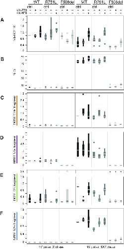 Figure 3. Impact of R751L on cystic fibrosis transmembrane conductance regulator (CFTR) protein folding and transport and cell surface expression. A and B: i) human embryonic kidney 293 (HEK-293) cells expressing wild-type (WT), R751L, and F508del CFTR constructs were labeled with 35S-methionine/cysteine for 15 min and chased for 0 (0′; A) and 2 h (120′; B) in the presence of VX-770 (3 µM), VX-809 (3 µM), or DMSO control (ctrl). Cells were lysed in 1% Triton X-100, and lysates were treated or not with proteinase K (25 µg/mL) for 15 min. CFTR and fragments were immunoprecipitated using TMD1C (TMD1; ii), Mr. Pink (NBD1 and full-length CFTR; iii), TMD2C (TMD2; iv), or 596 (NBD2) antibodies (v). *Nonspecific bands. N1a, protease-resistant NBD1-specific fragment; N2a, protease-resistant NBD2-specific fragment; T1d-f, protease-resistant TMD1-specific fragments; T2c, protease-resistant TMD2-specific fragment. T1, T2, and N2 fragments represent domain assembly, which is a late-folding stage of CFTR. C: cell surface biotinylation was performed in HEK-293 cells expressing CFTR constructs in the presence of VX-809, VX-770, or DMSO ctrl pretreatment. Cells were lysed in 1% Triton X-100, and lysates were used for pulldown of biotinylated proteins with Neutravidin beads. Proteins were analyzed on 7.5% SDS-PAA gels and transferred to PVDF membrane and blotted for CFTR (596) or actin. R751L was similar to WT-CFTR in transport to the Golgi (120′ chase), protein folding (protease resistance) of all 4 domains at both time points, and presence at the cell surface. Quantification for this data from 4 independent experiments is shown in Fig. 4.