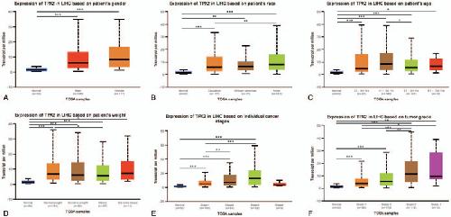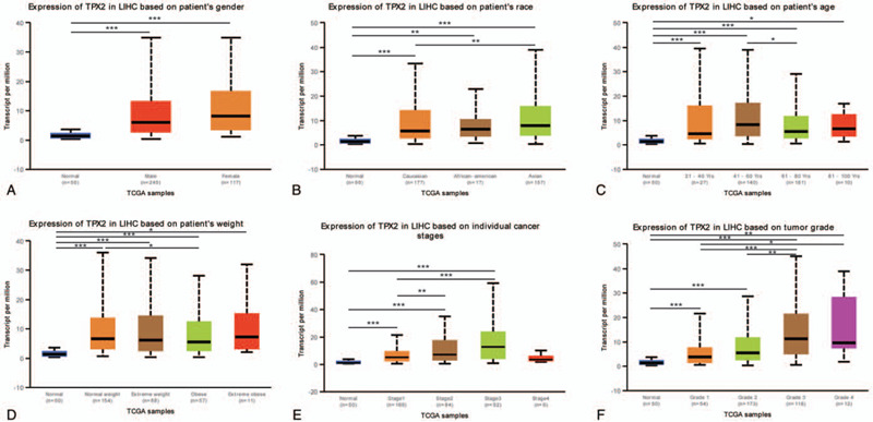 Figure 3. TPX2 transcriptional level in subgroups of patients with HCC. (A) Boxplot showing expression level of TPX2 in normal individuals of either gender and male or female HCC patients, respectively. (B) Boxplot showing expression level of TPX2 in normal, African American, Caucasian, and Asian HCC patients. (C) Boxplot showing expression level of TPX2 in normal individuals of any age or in HCC patients aged 21-40, 41-60, 61-80, or 81â100 yr. (D) Boxplot showing expression level of TPX2 in normal individuals of any weight or in HCC patients with normal weight, extreme weight, obese or extreme obese. (E) Boxplot showing expression level of TPX2 in normal individuals or in HCC patients at stages 1, 2, 3, or 4. (F) Boxplot showing expression level of TPX2 in normal individuals or HCC patients with grade 1, 2, 3, or 4 tumors. âPâ<â.05, â Pâ<â.01, â¡Pâ<â.001.