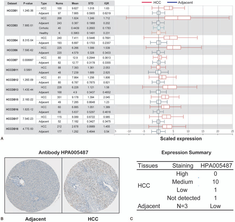 Figure 2. TPX2 expression level in HCC. (A) Chart and box plot showing the expression of TPX2 in cancerous tissues and the adjacent normal tissues, according to t test in HCCDB. (B) The protein expression of TPX2 in HCC from HPA. (C) Distribution of TPX2 protein expression level in HCC in HPA.