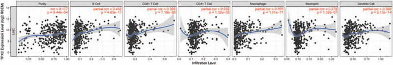 Figure 5. Association analysis of TPX2 expression and infiltration levels of immune cells in HCC. TPX2 expression in HCC tissues was positively associated with tumor purity and infiltration levels of B cells, CD8+ T cells, CD4+ T cells, macrophages, neutrophils, and DCs.