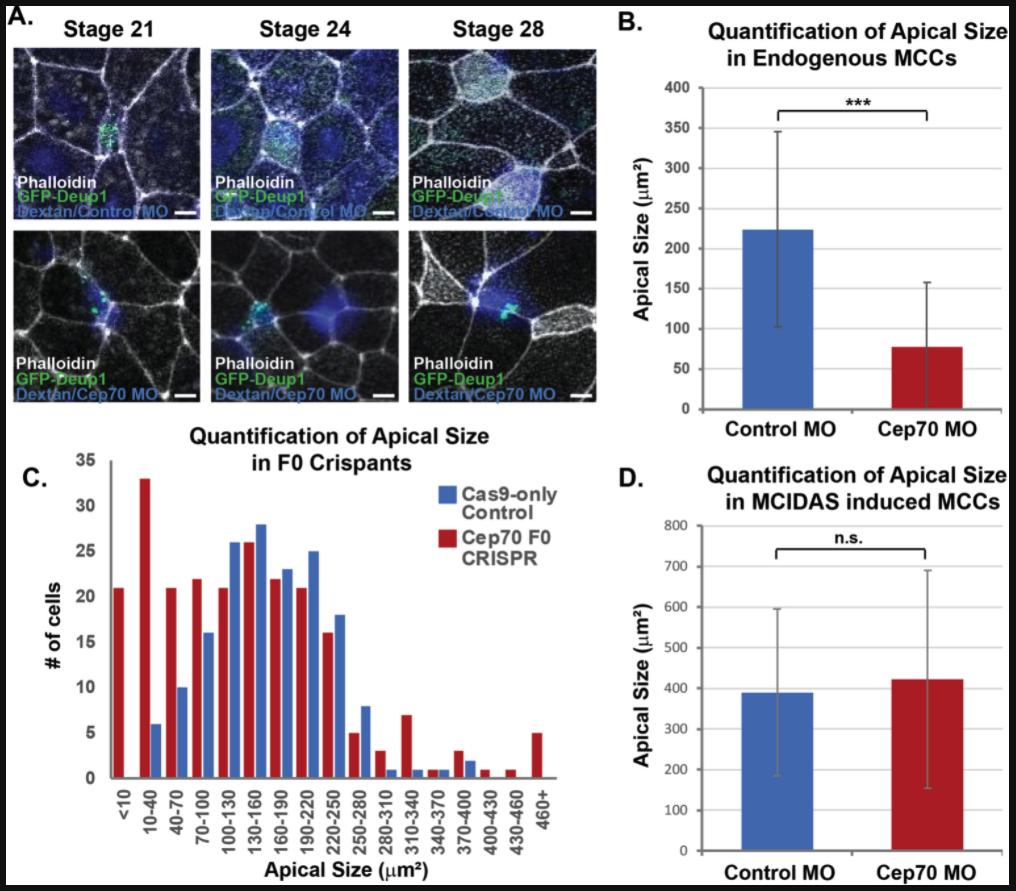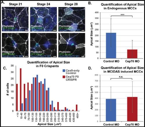 Fig. 5. Cep70 affects radial intercalation of MCCs. A, Time course of MCCs (marked with transgenic Tub-GFP-Deup1) undergoing intercalation in embryos injected with Dextran and a control MO (blue, top) or Cep70 MO (blue, bottom) showing examples of MCCs that have failed to intercalate (blue, bottom). Scale Bar is 5 âμm. B, Quantification of MCC apical size in morphant embryos from experiments in Fig. 4 A, C, and E (âââp<0.001, n > 85 âcells). C, Quantification of apical size in F0 crispant embryos; data is presented as a histogram of the number of cells observed in each bin (as labeled, n â> â167 âcells). D, Quantification of ectopic MCC apical size in morphant embryos from experiments in Fig. 4 IâK (n.s. not significant, n â> â107 âcells). |