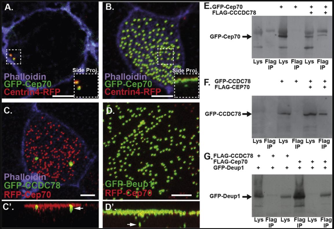 Fig. 1. Cep70 is a deuterosome associated protein. A-B, Z-projections of a non-MCC (A) and an MCC (B) labeled with the centriole marker Centrin4-RFP (red) and GFP-Cep70 (green), inlays are side projections. Scale bar is 5μm. C-D, Mature MCCs in embryos injected with RFP-Cep70 and GFP-CCDC78 (C) and GFP-Deup1 (D). Câ-Dâ, side projections of C-D with arrows identifying colocalization below the apical surface. Scale bar is 5μm. E, Co-IP using FLAG beads to pull down FLAG-CCDC78 followed by an anti-GFP Western blot to identify GFP-Cep70. F, Co-IP using FLAG beads to pull down FLAG-Cep70 followed by anti-GFP Western blot to identify GFP-CCDC78. G, Co-IP using FLAG beads to pull down either FLAG-CCDC78 (lanes 1â3) or FLAG-Cep70 (lanes 4â6) followed by anti-GFP Western blot to identify GFP-Deup1. |