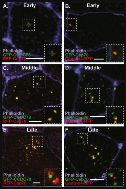 Fig. 2. Dynamic localization of Cep70 to the deuterosome. A-F Images of ectopic MCCs from embryos injected with the MCC inducing factor hGR-MCIDAS, treated with Dex and co-injected with RFP-Cep70 and the deuterosome marker GFP-CCDC78 (A, C, E) or GFP-Cep70 and the centriole marker Centrin4-RFP (B, D, F) stained with phalloidin. A-B, Early phase (2-3Hrs) of MCC development with Cep70 co-localizing to parental centrioles (B) but not nascent deuterosomes marked by CCDC78 (A). C-D, Middle phase (4-6Hrs) of MCC development showing FP-Cep70 co-localizing with GFP-CCDC78 at deuterosomes (yellow foci in E) but not at parental centrioles (red foci in C) and co-localizing with centrin4-RFP at parental centrioles (yellow foci in D) but not deuterosomes (green foci in D). Late phase (>6Hrs) of MCC development showing FP-Cep70 co-localizing with GFP-CCDC78 at deuterosomes (yellow foci in E) but not at presumptive nascent centrioles (red foci in E) and co-localizing with Centrin4-RFP at nascent centrioles (yellow foci in F) but not presumptive deuterosomes (green foci on F). Scale bar is 5μm. |