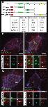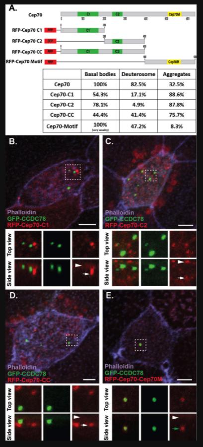 Fig. 3. Different domains of Cep70 contribute to different cellular localizations. A, Domain map of Cep70 and description of the 4 individual domain constructs used in B-E along with quantification of localization for each construct (n â> â30 âcells for each condition). Scale bars are 5μm. B-E, Localization of GFP-CCDC78 (green) and RFP-Cep70 (red) domain constructs in mature MCCs stained with phalloidin (purple) with boxed areas blown up and shown without phalloidin both top and side projections. B, RFP-Cep70-C1 localizing weakly at the level of basal bodies (arrowhead) and in cytoplasmic aggregates (white arrow). C, RFP-Cep70-C2 localizing strongly at the level of basal bodies (arrowhead) and in cytoplasmic aggregates (white arrow). D, RFP-Cep70-CC localizing weakly at the level of basal bodies (arrowhead) and in cytoplasmic aggregates (white arrow). E, RFP-Cep70-Cep70M localizing very weakly at the level of basal bodies (arrowhead) and at the deuterosome (green arrow). |