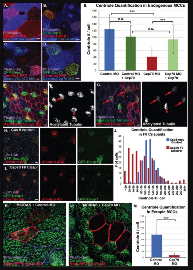 Fig. 4. Cep70 is required for centriole amplification. A-E, MO analysis in endogenous MCCs. A, MCCs from embryos injected with Centrin-RFP (red) and mosaically with Control MO marked with Dextran (blue) stained with phalloidin (purple). B, MCCs from embryos injected with Centrin-RFP (red) and mosaically with Control MO marked with Dextran (blue) together with GFP-Cep70 and stained with phalloidin (purple). C, MCCs from embryos injected with Centrin-RFP (red), GFP-Deup1 (green) and mosaically with Cep70 MO marked with Dextran (Blue) stained with phalloidin (purple). D, MCCs from embryos injected with Centrin-RFP (red) and GFP-Cep70 (green) mosaically with Cep70 MO marked with Dextran (blue) stained with phalloidin (purple). E, Quantification of centriole number in embryos from conditions imaged in A-D (âââp<0.001, n.s. not significant, n â> â85 âcells). F, Mosaic embryo showing strong cilia staining with acetylated tubulin (green/white) in both WT cells (arrowhead, not red) and in control MO cells (arrow, red), stained with phalloidin (purple). G, Mosaic embryo showing strong cilia staining (green/white) in WT cells (arrowhead, not red) but not in Cep70 MO cells (arrow, red), stained with phalloidin. H-J, CRISPR analysis in transgenic Tub-GFP-Deup1 (green) embryos. H, Cas9 alone control embryo stained with anti-centrin mAb (red) and phalloidin (purple). I, MCCs (green) from embryos injected with Cas9 and Cep70 sgRNA stained with anti-centrin mAb (red) and phalloidin (purple). J, Quantification of centriole number in MCCs from F0 crispant embryos; data is presented as a histogram of the number of cells observed in each bin (as labeled, n â> â167 âcells). K-M, MO analysis in hGR-MCIDAS induced ectopic MCCs. K, MCCs from embryos uniformly injected with hGR-MCIDAS and centrin-GFP (green) and mosaically with control MO together with mem-RFP as a marker (red) and stained with phalloidin (purple). L, MCCs from embryos uniformly injected with hGR-MCIDAS and centrin-GFP (green) and mosaically with Cep70 MO together with mem-RFP as a marker (red) and stained with phalloidin (purple). K, Quantification of the average centriole number from MCCs from conditions in I-J(âââp<0.001, n > 107 âcells). Scale bars are 5μm. |