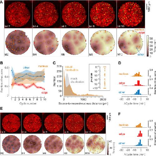 Figure 5. Phage DNA forms nuclei that can act as trigger wave sources.(A) Montage from a typical experiment showing the microtubules (top) and the heat map representation of the microtubule sources (bottom) for cycles 2, 4, 6, 8, and 10. Nucleus-associated sources are shown in orange; edge-associated sources are shown in red; and other sourcesâthat is, those not associated with edges or nucleiâare shown in blue (other). The top panels show the extracts in interphase, with SiR-tubulin fluorescence in red and NLS-mCherry in green. The bottom panels are the heat maps of the mitotic sources. The coloring of the heat map denotes the time at which each pixel entered mitosis relative to the earliest pixels in that cycle. (B) Fraction of the mitotic sources associated with nuclei, edges, or no obvious structures as a function of cycle number. The data points are mean fractions from eight experiments where the extracts cycled at least 10 times, and the shaded regions show the means ± SEM. (C) The distance of the trigger wave sources to the nearest nucleus (orange), compared to a mock distribution (gray). Data are from 44 cell cycles from 11 experiments and include 419 sources. The inset shows probabilities (p-values) of obtaining the observed number of mitotic sources (or more than the observed number) that are close (<100 µm) to nuclei for the 44 cell cycles individually, calculated by bootstrapping with 105 randomized source positions for each individual cycle. (D) The duration of the cell cycle at nucleus-associated sources, edge sources, and other sources relative to the slowest 15% of the well. Data are from 15 experiments and include 205 nucleus-associated sources, 102 edge sources and 201 other sources. (E) Montage from an experiment with added phage DNA plus centrosomes. (F) The duration of the cell cycle at nucleus-associated sources, edge sources, and other sources relative to the slowest 15% of the well, for extracts with added phage DNA plus centrosomes. Data are from 12 experiments and include 123 nucleus-associated sources, 79 edge sources and 209 other sources.Figure 5âvideo 1. Trigger waves of tubulin depolymerization and polymerization in a Xenopus extract supplemented with λ-bacteriophage DNA (5 µg/ml).Related to Figure 5. |