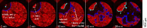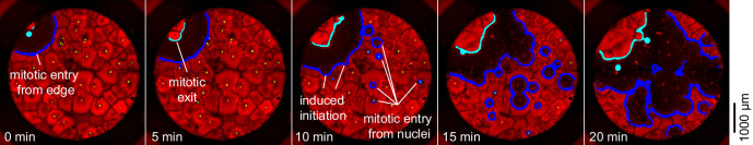 Figure 2—figure supplement 1. Mitosis initiating from a source at the edge of a well.In this cycle, the first place at which mitosis occurred was a point on the edge of the well with no obvious nucleus nearby. Ten minutes later, mitosis began initiating at several nuclei at once. |
