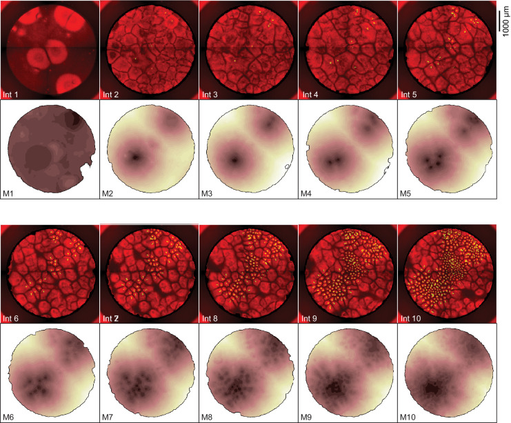 Figure 1—figure supplement 1. Heat maps showing the dynamics of mitosis for the experiment shown in Figure 1.The fluorescence images are identical to the interphase snapshots shown in Figure 1C and are included for comparison. The dark regions in the heat maps are the areas where mitosis occurred earliest. |