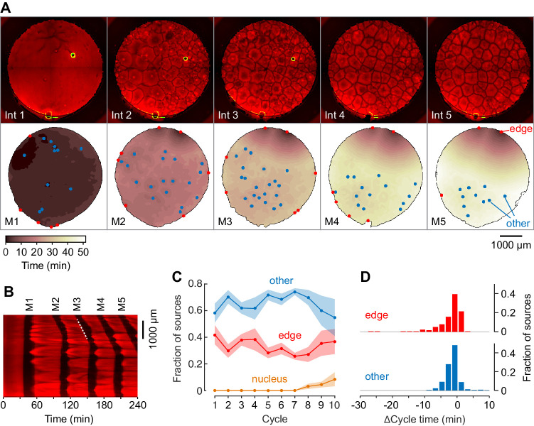 Figure 3. Mitotic waves in cycling extracts with no added sperm chromatin, DNA, or centrosomes.(A) Montage from a typical experiment showing the microtubules (top) and the heat map representation of the mitotic dynamics (bottom) for the first five cycles. Edge-associated sources are shown in red; other sourcesâthat is, those not associated with edges or nucleiâare shown in blue (other). The greenish circle in the upper right-hand quadrant of the first three frames of the microtubule montage is a bubble, not a nucleus. The coloring of the heat map representation denotes the time at which each pixel entered mitosis relative to the earliest pixels in that cycle. See also Figure 3âvideo 1. (B) Kymograph based on Figure 3âvideo 1. The kymograph was calculated for a slice beginning at the edge source at 1:00 in (A) and transecting the well. The trigger wave speed at the entrance to M3 was 60 µm/min (dashed white line). (C) Mean fraction of the mitotic sources originating from edges, nuclei, and other locations as a function of cycle number. Data are from six experiments. (D) Acceleration of the cell cycle at edge sources and other sources relative to the slowest 15% of the well. Data are from 24 experiments and include 176 edge sources and 393 other sources.Figure 3âvideo 1. Trigger waves of tubulin depolymerization and polymerization in a Xenopus extract supplemented with no sperm, centrosomes, or nuclei added.Related to Figure 3. |