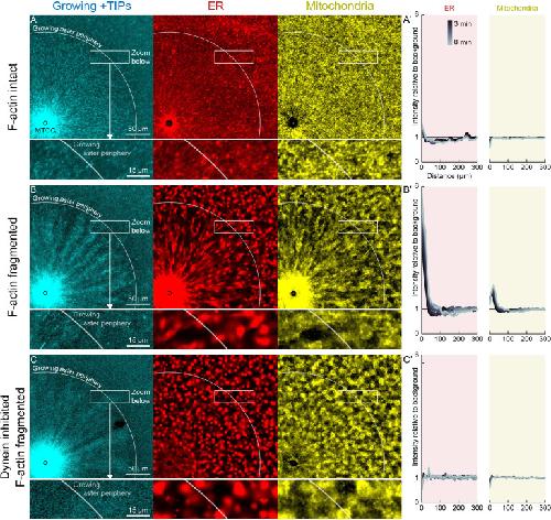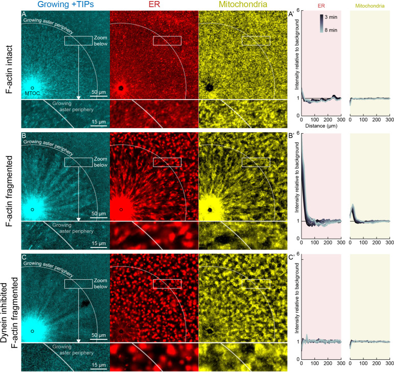 Figure 6. Dynein-mediated organelle movement is restricted by F-actin.(A) In control with intact F-actin, a small amount of ER became concentrated around the MTOC, but the majority of the ER and mitochondria remained distributed over the aster (see Video 8). The white arc indicates the growing aster periphery, and the box indicates the zoomed region in the lower panels. (Aâ) Average intensity with respect to distance from the MTOC over time, from black to gray. (B) When F-actin was fragmented with Cytochalasin D, a greater fraction of the ER was transported toward the MTOC, and a fraction of mitochondria was transported as well. Higher magnification: ER started to move when MTs indicated by growing +TIPs first grew into the cytoplasm, and ER and mitochondria co-localized with one another. (C) When dynein was inhibited with p150-CC1, the ER was not transported, neither toward nor away from the MTOC.Figure 6âsource data 1. ER and mitochondria intensity profiles for panels Aâ, Bâ, and Câ.Intensity profiles were normalized to the average intensity outside the aster to correct for photobleaching. |