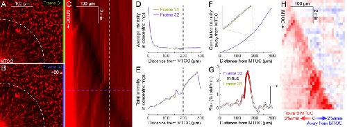 Figure 7—figure supplement 2. Explanation of flux analysis of organelle transport.(Related to Figure 7) (A,B) Subsequent frames in a video to measure dynein-based flux of organelles along astral MTs. The flux analysis requires that the region of interest (ROI) contains the entire aster at all times, so there is no transport of organelles into or out of the ROI, just radial redistribution of organelles along astral MTs within the ROI. Images were flat field corrected, then normalized to constant total intensity to correct for photobleaching. (C) Kymograph of average organelle intensity in concentric rings away from the MTOC. Frames 31 (green, panel A) and 32 (purple, panel B) correspond to the rows of the kymograph indicated by horizontal dotted lines. The distance to the aster periphery at this time, indicated by the white dotted arc in panels A and B, is indicated by the vertical white dotted line. (D) Average organelle intensity in concentric rings away from the MTOC. (E) Total intensity in concentric rings away from the MTOC. The total intensity increases roughly linearly with the circumference. (F) Cumulative total intensity away from the MTOC. Zoomed inset shows where the cumulative total intensity at frame 32 most exceeds that at frame 31. (G) Flux of fluorescence intensity toward the MTOC, calculated as the cumulative total intensity at frame 32 minus that at frame 31. Flux was normalized to the percentage of the total fluorescence intensity moving across each bin edge (10 µm) per min. (H) Flux map in the same frame of reference as the kymograph in panel C. Panel G corresponds to the row indicated by the horizontal black dotted line. |