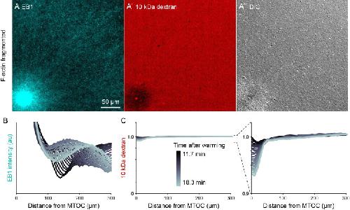 Figure 7âfigure supplement 3. Dextran was excluded in organelle-rich region within ~50 µm of MTOCs.(Related to Figures 7 and 8, Video 13) (A) The growing +TIPs of MTs were labeled with EB1-GFP, the relative concentration of cytosol was inferred from 10 kDa dextran labeled with Alexa-Fluor 568, and organelles were visualized with differential interference contrast (DIC). Images taken 18.3 min after warming to 20°C and the onset of aster growth. (B,C) Intensity profiles away from the MTOC colored by time point. In the EB1 graph, the wavefront corresponds to the growing aster periphery. To correct for photobleaching, dextran profiles were normalized to the intensity at the point farthest from the MTOC. |