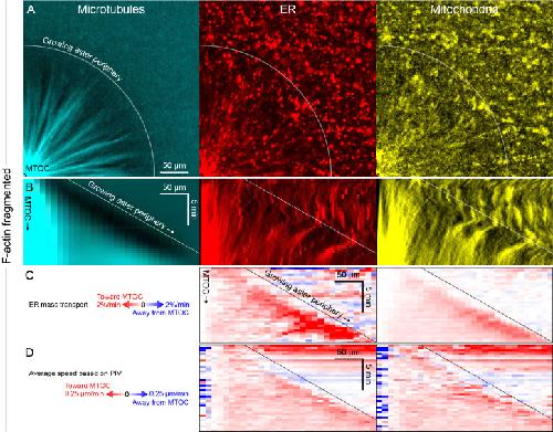Figure 7—figure supplement 1. Like other organelles, mitochondria exhibited a burst of organelle movement near the growing aster periphery.(Related to Figures 6 and 7, Video 11) (A) F-actin was fragmented by Cytochalasin D. Microtubules were labeled with tubulin-Alexa Fluor 647, ER with DiD, and mitochondria with TMRE. (B) Kymographs along a line from the MTOC. (C) Mass transport map for ER and mitochondria averaged over a quadrant, in the same frame of reference as the kymographs in panel B. Mass transport analysis is described in Figure 7—figure supplement 2. (D) Average speed based on PIV, in the same frame of reference as panels B and C, and averaged over a quadrant. In all analysis methods, mitochondria behaved similar to acidic organelles and likewise exhibited a burst of movement at the growing aster periphery. |