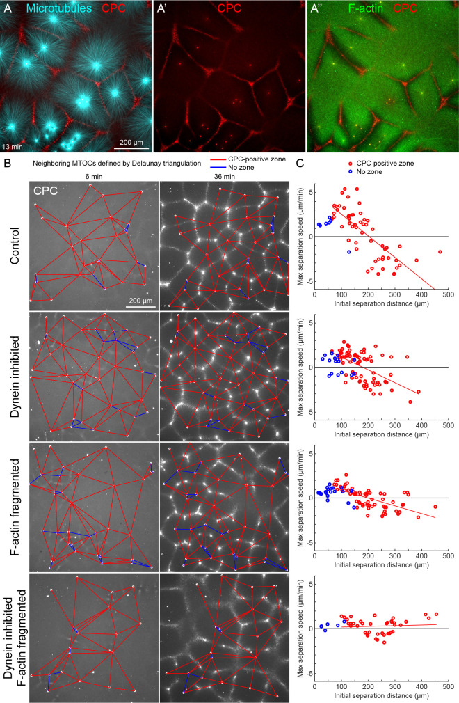 Figure 2. MTOC separation movement in egg extract by dynein and actomyosin.(A) The CPC localized to interaction zones between neighboring asters, blocking mutual interpenetration of MTs and disassembling F-actin locally. Time is defined with respect to perfusing the sample and warming to 20°C, so the start of aster growth occurred soon after 0 min. (B) Four aster growth reactions were followed in parallel under control vs inhibitor conditions. The first column in each condition shows an early time point, and the second column shows a time point 30 min later. MT growth was similar and CPC-positive interaction zones formed under all conditions (see Video 3). (C) Maximum speed of separation with respect to initial distance between the MTOCs. Red lines indicate linear fits to red points.Figure 2âsource data 1. MTOC trajectories and Delaunay triangulations for panels B and C.The âbeadsâ variables are structures that contain the MTOC trajectories. Some MTOCs enter or exit the image during the movie, and the âtâ field within each element represents the frames during which an MTOC was present, with 1 the first frame and 10 the last frame. The âxâ and âyâ fields represent the MTOC position, and the ânnâ field represents the indices of the nearest neighbor MTOCs defined by the Delaunay triangulation. The âpairsâ variables enumerate all pairs of nearest neighbor MTOCs, that is, the edges in panel B. The last column is 0 if the corresponding interaction zone was not CPC-positive, and 0.5 or 1 if the corresponding interaction was CPC-positive. The âedgesâ variables list all neighboring edges for each edge. |