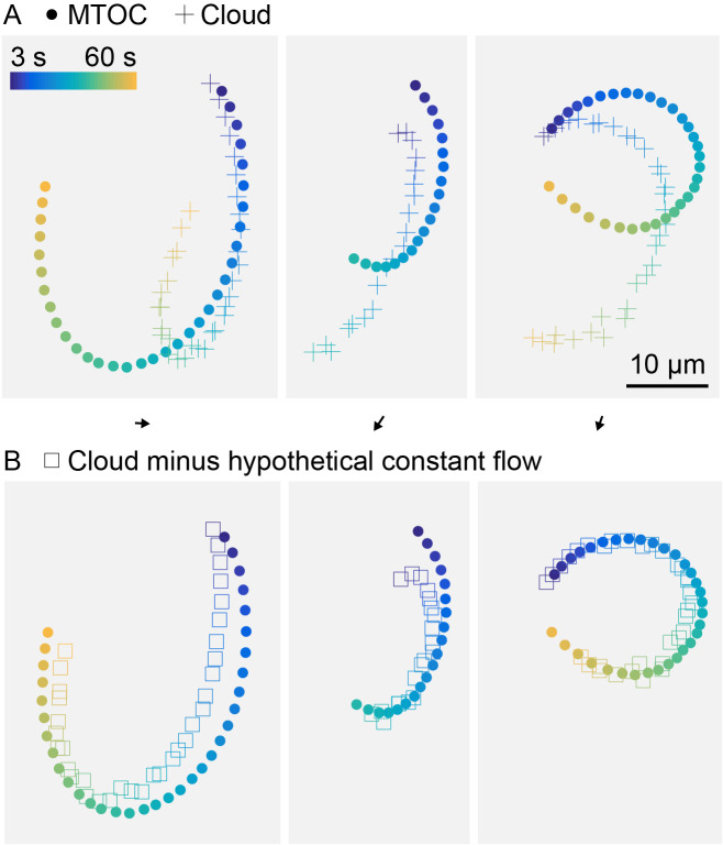 Figure 5—figure supplement 1. Hypothetical constant flow permeating asters can improve registration between MTOC and center of fluorescein cloud.(Related to Figure 5) (A) Trajectory of MTOC (circle) and center of the fluorescein cloud, within aster oscillating on HOOK2-functionalized coverslip, same as Figure 5F. (B) Trajectory of MTOC (circle) and center of the fluorescein cloud after computationally subtracting a constant flow (square). Flow direction and magnitude shown as a black arrow above each panel. The hypothetical constant flow was optimized to minimize the difference between the MTOC and cloud trajectories.Figure 5—figure supplement 1—source data 1. Width of the fluorescein cloud vs time for panel E, and MTOC and cloud center trajectories for panel F.The ‘driftVec’ variables are the hypothetical constant flow that was optimized to minimize the difference between the MTOC and cloud trajectories for Figure 5—figure supplement 1. |