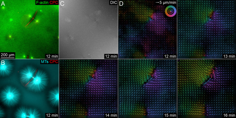 Figure 5âfigure supplement 2. Separating asters exhibited saddle-shaped flow fields, consistent with advection of cytosol by moving asters.(Related to Figure 5) (A,B) F-actin labeled with Lifeact-GFP, CPC labeled with anti-INCENP-Alexa Fluor 647, and MTs labeled with Tau-mCherry. (C) Differential interference contrast to visualize mitochondria and other small vesicles. (D) Flow fields of the DIC channel estimated by PIV exhibited a saddle shape, with flow along the interaction zone toward the midpoint between the asters. F-actin and MTs exhibited similar flow fields. Color represents direction (legend in upper right of first panel), and brightness represents velocity. Note that arrows are downsampled from full flow fields. Time with respect to warming the sample and the onset of aster polymerization. |