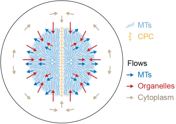 Figure 9. Model for component flows during aster separation movement in frog eggs.Within moving asters, all cytoplasmic networks move together, advecting cytosol. Near the aster periphery, organelles flow rapidly inwards while MTs flow outwards. Outside the aster, cytosol is displaced around asters and into the midplane by hydrodynamic forces. |