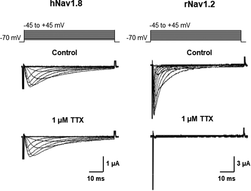 Figure 1. Expression of human Nav1.8 and rat Nav1.2 in Xenopus oocytes. (a) When expressed in Xenopus oocytes, hNav1.8 mediates an inward Na+ current with slow activation and inactivation kinetics that is unaffected by 1 μM tetrodotoxin (TTX). (b) In contrast, rat Nav1.2 mediates a Na+ current exhibiting fast activation and inactivation kinetics that is completely abolished by the application of 1 μM TTX. Oocytes were held at â 70 mV and depolarized to voltages between â 50 and +40 mV in 10 mV increments. External solutions containing TTX (1 µM) were applied through the perfusion system |