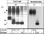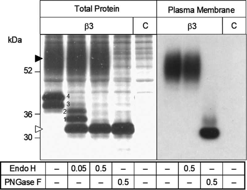 Figure 2. Biochemical analysis of the synthesis and plasma membrane transport of the sodium channel β3 subunit in Xenopus laevis oocytes. Oocytes injected with cRNA encoding the His-tagged β3 subunit or non-injected controls (c) were metabolically labeled with [35S]-methionine (left panel) or surface-iodinated with [125I]-sulfo-SHPP (right panel). His-tagged protein was purified via Ni2+-NTA-agarose, treated with endoglycosidases (concentrations given in IUB milliunits/ml sample) as indicated, and separated on a 10% SDS-PAGE gel. Black and white triangles indicate complex glycosylated and completely deglycosylated protein, respectively. Numbers 1–4 indicate the Endo H-sensitive core-glycosylated and partly deglycosylated forms of the protein |