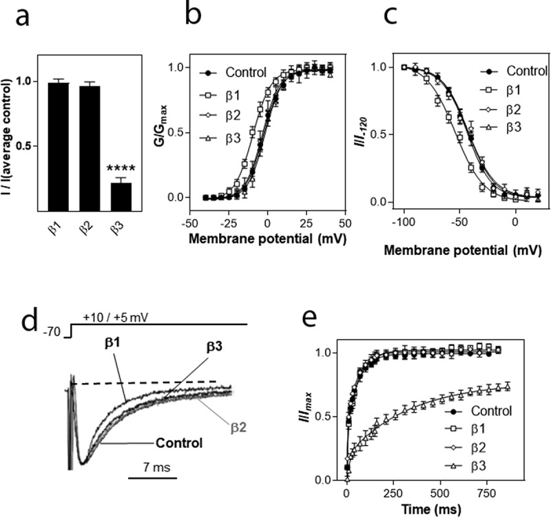 Figure 3. Modulation of hNav1.8 by auxiliary β subunits. (a) Effects of β subunits on Na+ current amplitude. I represents maximal Na+ current amplitude of oocytes expressing hNav1.8 (2 ng cRNA/oocyte) alone or in combination with β1, β2 or β3 (5 ng cRNA/oocyte). I(average control) represents the average maximal Na+ current amplitude of oocytes expressing only hNav1.8. Maximal Na+ current amplitude was determined by step depolarizations to voltages between â 50 and +50 mV (5 mV increments) from a holding potential of â 70 mV. The voltages at which maximal Na+ current amplitude was obtained was +5 mV for hNav1.8 + β1 and +10 mV for the other combinations (including Nav1.8 in the absence of β subunits). Curves show the Na+ conductance (G) obtained at different voltages relative to the maximal conductance (Gmax). Conductance curves were fitted with single exponential functions for the hNav1.8 α subunit alone and in the presence of the various β subunits. (c) Voltage-dependence of inactivation. I represents the Na+ current elicited by a depolarizing pulse to the voltage generating maximal Na+ current amplitude immediately after long (1 s) pre-pulses to different voltages. Iâ120 represents the Na+ current amplitude elicited by an identical depolarizing pulse generated after a long pre-pulse to â 120 mV, where inactivation is minimal. I/Iâ120 represents the fraction of maximal Na+ current available after steady-state inactivation at each voltage. (d) Inactivation kinetics. Superimposed traces normalized to the same value are shown for Na+ currents mediated by hNav1.8 in the absence and presence of the β1, β2 and β3 subunit (5 ng cRNA/oocyte). Oocytes were held at â 70 mV and depolarized to the voltage that elicited maximal Na+ current amplitude. (e) Recovery from inactivation. The fraction of Na+ current recovering from steady-state inactivation after different periods of time (2.5 ms â 1 s) was determined for hNav1.8 (2.5 ng cRNA/oocyte) expressed alone or together with the β1, β2 or β3 subunit (5 ng cRNA/oocyte). Na+ current was first inactivated by a 1 s pulse to 0 mV. After a variable recovery period ranging from 2.5 ms â 1 s, a depolarizing pulse to elicit maximal Na+ current amplitude was applied. The Na+ current amplitude after different recovery times (I) was compared to the Na+ current amplitude elicited by an identical control pulse that was not preceded by inactivation (Imax). The recovered fraction of Na+ current (I/Imax) was plotted against recovery time and fitted with double exponential functions |
