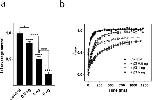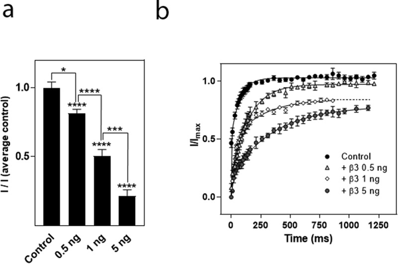Figure 4. Effects of the α:β3 ratio on β3-mediated modulation of the hNav1.8 current amplitude and recovery from inactivation. (a) Effects of the α:β3 ratio on current amplitude. Maximal Na+ current amplitude was recorded from oocytes injected with cRNA for hNav1.8 (2.5 ng/oocyte) alone or together with 0.5, 1, or 5 ng of cRNA encoding the β3-subunit. I represents maximal Na+ current amplitude in the various groups while I(average control) represents the average maximal Na+ current amplitude of control (oocytes expressing only hNav1.8). N = 30–41 oocytes/group. (b) Effects of the α:β3 ratio on the repriming kinetics of hNav1.8. Recovery from inactivation was determined as described for hNav1.8 alone. The Na+ current amplitude after different recovery times (i) was compared to the Na+ current amplitude generated by an identical control pulse (Imax). The repriming curves were fitted with double exponential functions (N ≥ 10 oocytes/group) |
