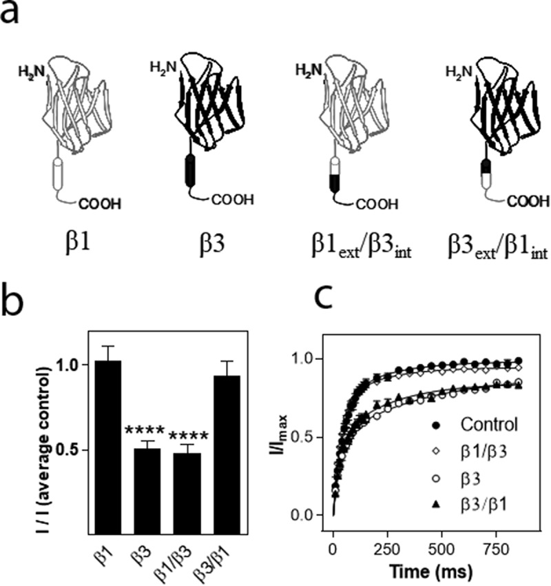Figure 6. Effects of β subunits chimeras on maximal current amplitude and recovery from inactivation of hNav1.8. (a). Schematic showing the structure of the wild-type β1 and β3 subunits and the constructed chimeras (β1: white, β3: black). (b) Effects on Na+ current amplitude. Maximal Na+ current amplitude was determined for oocytes expressing hNav1.8 alone or in combination with the rat β3 chimera subunits. I represents maximal Na+ current amplitude of oocytes expressing hNav1.8 alone or in combination with the β3 chimera subunits |