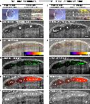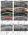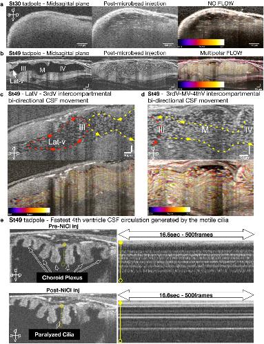 Fig. 3. Late pre-metamorphosis tadpole displays complex compartmental CSF circulation and bidirectional intercompartmental mixing. a Mid-sagittal plane in vivo OCT imaging of stage 30 tadpole before and after microbead injection. Temporal color-coded image shows suspended, static bead (Additional file 3: Movie S2). b Mid-sagittal plane in vivo OCT imaging of stage 49 tadpole before and after microbead injection. The temporal color-coded image shows multiplanar CSF circulation (Additional file 4: Movie S3). c Focused image shows the aqueduct between the lateralventricle and 3rd ventricle. The trajectory of the CSF circulation is shown by the red and yellow arrows (Additional file 5: Movie S4). d Focused image shows the aqueducts between the 3rd, midbrain (MV) and 4th ventricles (IV). The trajectory of the CSF circulation is shown by the red and yellow arrows (Additional file 6: Movie S5). (E) Focused 4th ventricle OCT image shows the choroid plexus projections (white arrows). Post-NiCl intraventricular injection, OCT image allows visualization of the static ependymal cilia (white arrowâAdditional file 6: Movie S6). Along the yellow line, the kymograph showing motile ciliaâs beating along the choroid plexus surface, which stops post NiCl injection