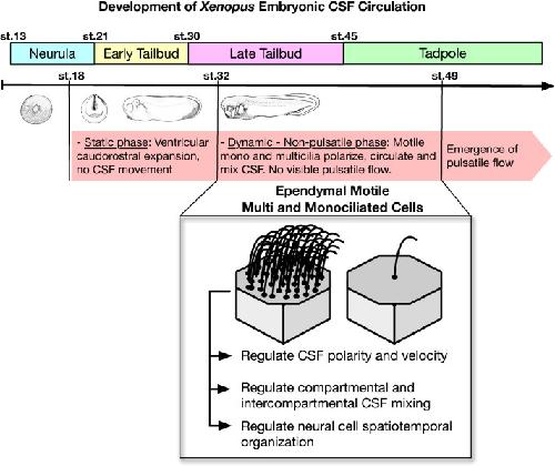 RESULTS: In Xenopus, using OCT imaging, we demonstrated that ventriculogenesis can be tracked throughout development until the beginning of metamorphosis. We found that during Xenopus embryogenesis, initially, CSF fills the primitive ventricular space and remains static, followed by the initiation of the cilia driven CSF circulation where ependymal cilia create a polarized CSF flow. No pulsatile flow was detected throughout these tailbud and early tadpole stages. As development progressed, despite the emergence of the choroid plexus in Xenopus, cardiac forces did not contribute to the CSF circulation, and ciliary flow remained the driver of the intercompartmental bidirectional flow as well as the near-wall flow. We finally showed that cilia driven flow is crucial for proper rostral development and regulated the spatial neural cell organization.