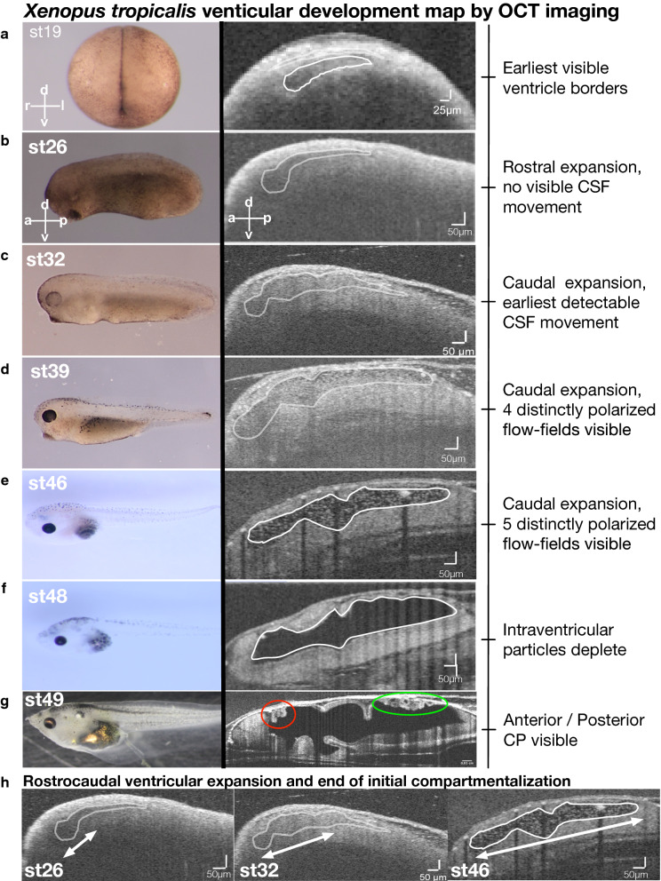 Fig. 1. Xenopus tropicalis ventricular development map by OCT imaging. Widefield and mid-sagittal plane in vivo OCT imaging of an individual embryo at various stages to track ventricular development. a Stage 19; the earliest stage at which ventricular space is visible. b Stage 26; rostral expansion of the ventricular space is shown. c Stage 32; caudal expansion and the earliest detectable intraventricular particle movement (Additional file 2: Movie S1). d Stage 39; continued caudal expansion and 4 distinct polarized flow fields are visible (Additional file 2: Movie S1). e Stage 46; further caudal expansion and 5 distinct polarized flow fields are visible (Additional file 2: Movie S1). f Stage 48; intraventricular particle density diminishes. g Stage 49; Anterior (red circle) and posterior (green circle) choroid plexus visible. h Rostrocaudal ventricular expansion progression. CSF: cerebrospinal fluid; CP: choroid plexus; OCT: optical coherence tomography, a: anterior; p: posterior; d: dorsal; v: ventral