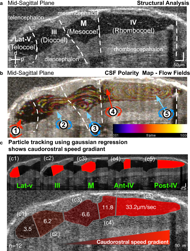 Fig. 2. Particle tracking with Gaussian process regression enables compartmental CSF flow speed measurements. a Mid-sagittal plane in vivo OCT imaging of a stage 46 tadpole outlining brain structures and ventricular spaces. b CSF polarity map based on temporally color-coded frames 1â1000 at the mid-sagittal plane delineates particle trajectories of 5 discrete flow fields (labeled 1â5). FF1: telencephalic, FF2: diencephalic, FF3: mesencephalic, FF4: anterior rhombencephalic, FF5: posterior rhombencephalic (red: clockwise, blue: counterclockwise). c Compartmentally-matched median CSF flow speed based on particle tracking using Gaussian process regression showing a caudo-rostral speed gradient. c1) Lateralventricle: 3.5 µm/s, c2) III ventricle: 6.2 µm/s, c3) Midbrainventricle: 6.6 µm/s, c4) Anterior IV ventricle: 11.8 µm/s, c5) Posterior IV ventricle: 33.2 µm/s. CSF: cerebrospinal fluid; a: anterior, p: posterior, d: dorsal, v: ventral, Lat-v: lateralventricle, III: 3rd ventricle, M: midbrainventricle, IV: 4th ventricle