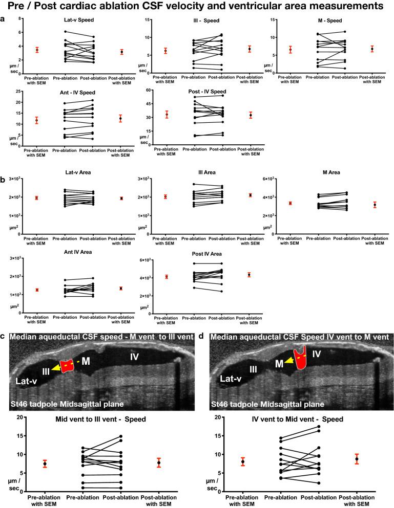 Fig. 5. Pre/post cardiac ablation CSF flow speed and ventricular area measurements (Stage 46). a Median compartmental CSF flow speed of the Lat-V, 3rd ventricle, midbrainventricle, anterior 4th and posterior 4th ventricle presented with before-after graphs. b Average compartmental cross-sectional area of the Lat-V, 3rd ventricle, midbrainventricle, anterior 4th and posterior 4th ventricle presented with before-after graphs. c Median compartmental flow speed along the aqueducts between the 3rd and midbrain ventricles, and the 4th and midbrain ventricles shown with before-after graphs. Red area outlines the cross section of where the particle velocimetry is applied, yellow-dotted arrow indicates the direction of flow. Lat-v: lateralventricle, III: 3rd ventricle, M: midbrainventricle, IV: 4th ventricle