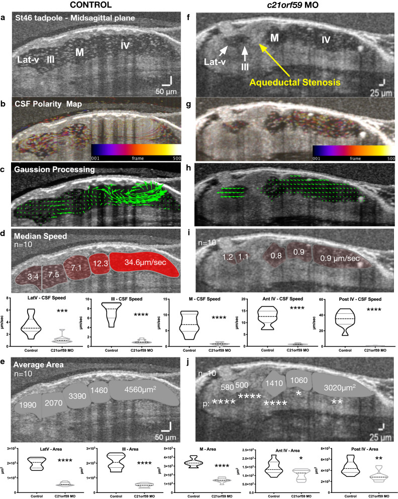 Fig. 7. Ependymal cilia driven flow is most impactful on rostral development. Mid-sagittal plane in vivo OCT imaging of stage 46 control and c21orf59 morphant tadpoles. a, f Midsagittal ventricular space, yellow arrow points the aqueductal stenosis. b, g CSF polarity flow map. c, h Post-Gaussian processing flow map. d, i Median compartmental flow speed. e, j Average compartmental area. *pâ<â0.01, **pâ<â0.001, ***pâ<â0.001, ****pâ<â0.0001