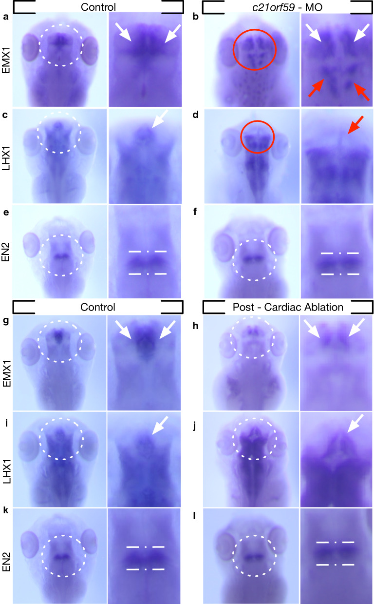c21orf59 knockdown results in a loss of the lhx1 expression in the telencephalon, indicated by a red arrow. e Normal expression of en2 mRNA in a stage 46 tadpole. Expression localizes to the midbrain-hindbrain boundary outlined with dotted white line. f