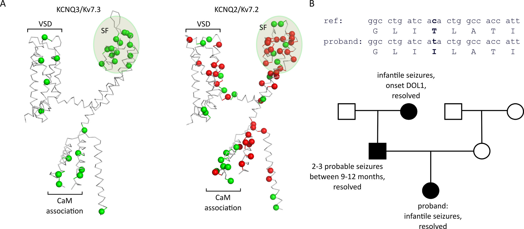 Figure 1. Inheritance of Kv7.2 and Kv7.3 mutations associated with epilepsy. A, Mutations in Kv7.2 or Kv7.3 associated with a documented case of epilepsy (compiled from ClinVar or RIKEE databases) are highlighted on molecular models of each channel. Mutations are color coded based on severity (green = BFNE, red = epileptic encephalopathy or other severe outcomes). Mutations that do not map to structural elements defined in the KCNQ1 cryoâEM structure have been omitted (VSD, voltageâsensing domain, SF, selectivity filter, CaM, Calmodulin). B, Pattern of inheritance of a neonatal seizure phenotype in a family carrying the Kv7.3[T313I] mutation. Upper, sequence alignment of the reference KCNQ3 gene and Kv7.3 protein in relation to the proband. The identified mutation [T313I] is highlighted in bold type. Lower, pedigree for the family characterized in our study with filled symbols indicating affected individuals