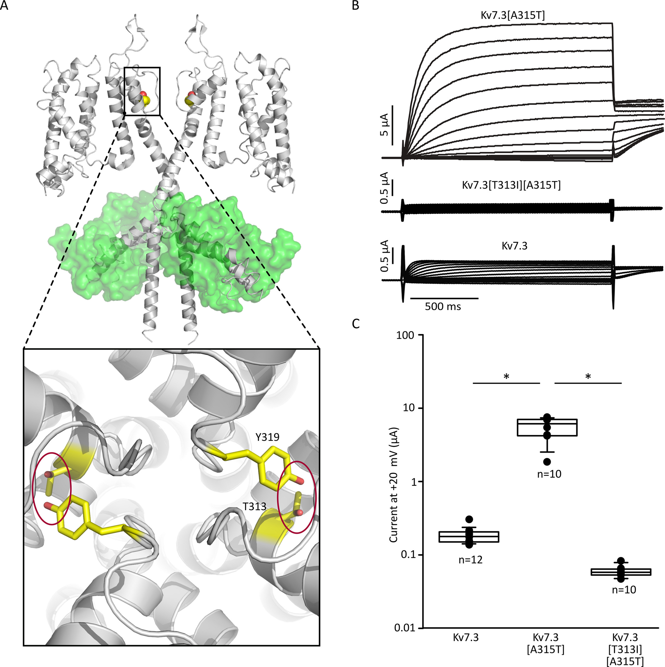 Figure 2. v7.3[T313I] abolishes Kv7.3 function. A, Molecular model of essential intersubunit hydrogen bond between conserved residues T313 and Y319 located in the selectivity signature sequence. B, Two‐electrode voltage‐clamp recordings from Xenopus laevis oocytes expressing Kv7.3[A315T] and Kv7.3[A315T][T313I]. Oocytes were held at −80 mV and depolarized for 1.5s to voltages between −140 mV and +40 mV (in 10‐mV steps) followed by repolarization to −20 mV test pulse. Current amplitudes at +20 mV of Kv7.3 [A315T] and Kv7.3[A315T] [T313I] were compared using a student’s t test (* indicates P<0.05 relative to A315T alone)