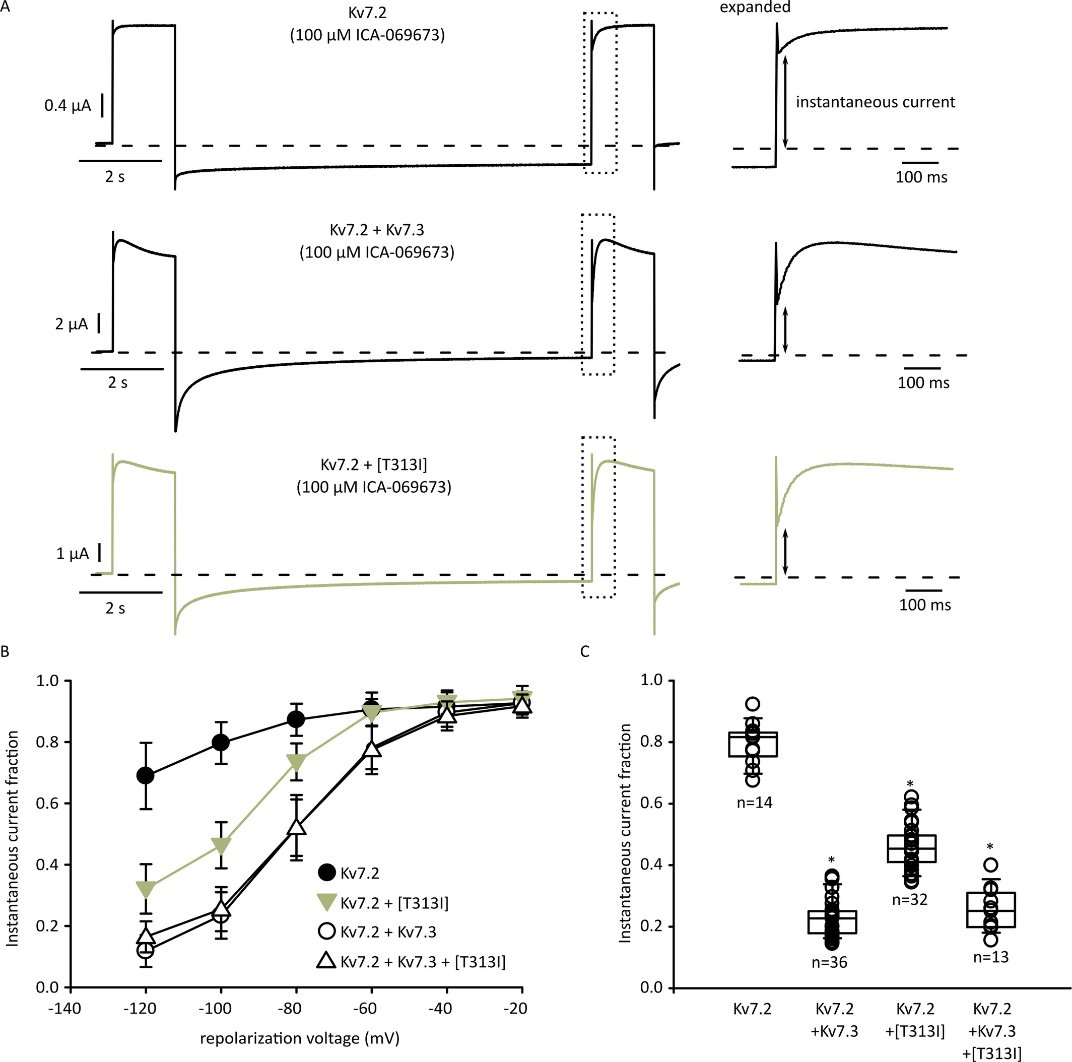 Figure 4. Reduced ICAâ069673 sensitivity of Kv7.2/Kv7.3[T313I] heteromeric channels. A, Example currents of twoâelectrode voltageâclamp recordings. Oocytes were depolarized to +20 mV and repolarized for 12 s in a stepâdown manner (â20 mV per sweep), followed by another +20 mV depolarizing pulse to determine instantaneous current at â100 mV. Currents within the dashed box are illustrated on an expanded time scale in the right panels, showing the assessment of instantaneous current levels in different experimental conditions. B, Fractional instantaneous current after incubation with 100 μmol/L ICAâ069673 was measured as indicated by the arrows in panel (A), data are shown as mean ± SEM. C, Fractional instantaneous current (repolarization voltage of â100 mV) for various combinations of Kv7.2, Kv7.3, and Kv7.3[T313I], shown on a cellâbyâcell basis (KruskalâWallis oneâway ANOVA on ranks, * indicates P < 0.05 relative to Kv7.2 homomeric channels)
