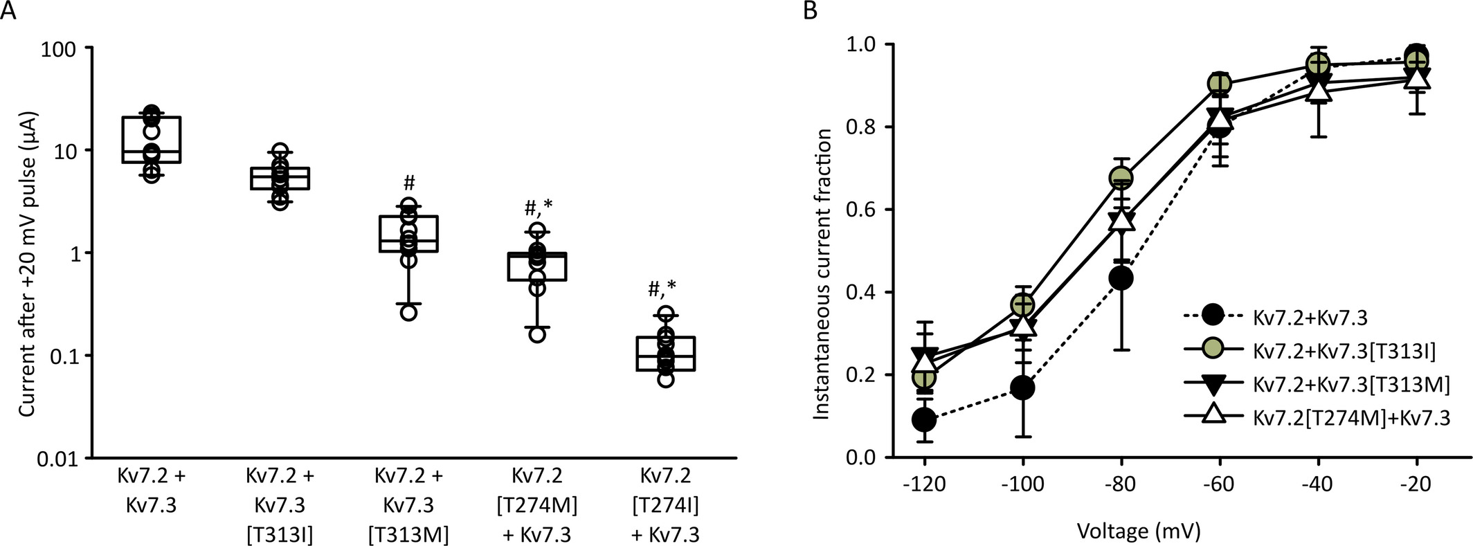 Figure 5. Variable outcomes of homologous selectivity filter mutations in Kv7.2 and Kv7.3. A, Current magnitude was measured at +20 mV in Xenopus oocytes injected with Kv7.2 + Kv7.3, or various combinations of channel mutants and their wildâtype counterpart, as indicated. Currents were recording 48â56 h after injection (n = 10 per condition, oneâway ANOVA on ranks and Tukey post hoc test, # indicates P < 0.05 relative to Kv7.2/Kv7.3, * indicates P < 0.05 relative to Kv7.2/Kv7.3[T313I]). B, Instantaneous tail current magnitudes were recorded as described in Figure 4 in the presence of 100 μmol/L ICAâ069673, for all possible combinations of injected channels (note that Kv7.3 + Kv7.2[T274I] did not yield current sizes that could be confidently assessed or analyzed)