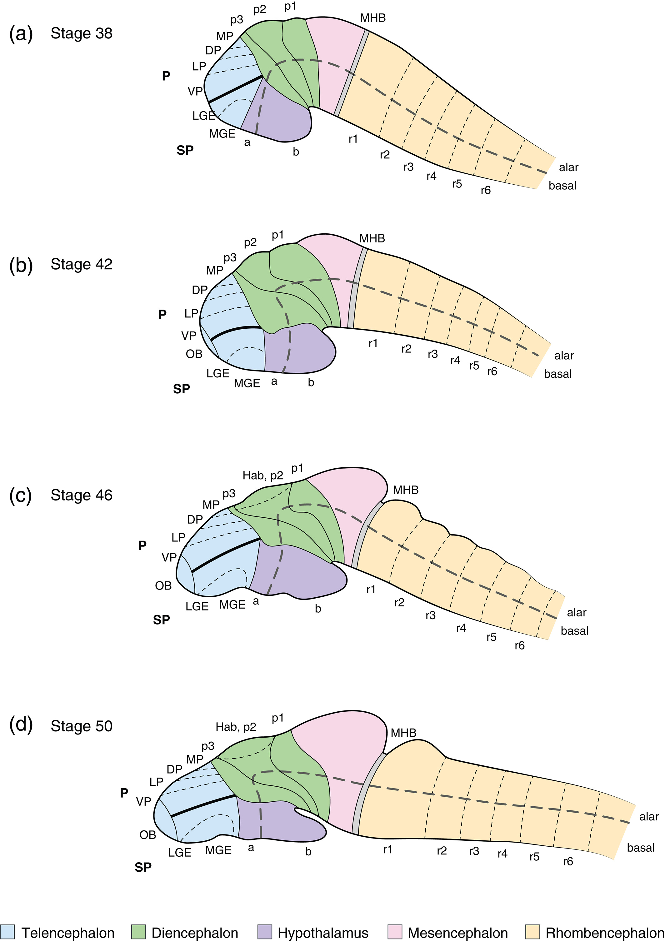 FIGURE 2 Schematic representations of the developing Xenopus brain. Lateral views of the Xenopus brain (anterior to the left and dorsal at the top) at NF (Nieuwkoop and Faber) stages 38 (a), 42 (b), 46 (c), and 50 (d). Colors demarcate the developing telencephalon (blue), hypothalamus (purple), diencephalon (green), mesencephalon (pink), midbrainâhindbrain boundary (MHB, gray), and rhombencephalon (yellow). Images are representative of X. laevis and X. tropicalis. See text for anatomical references. Xenopus stages according to Nieuwkoop and Faber (1994). a, alar; b, basal; DP, dorsal pallium; Hab, habenula; LGE, lateral ganglionic eminence; LP, lateral pallium; MGE, medial ganglionic eminence; MHB, midbrainâhindbrain boundary; MP, medial pallium; OB, olfactory bulb; P, pallium; p, prosomere; r, rhombomere; SP, subpallium; VP, ventral pallium |
