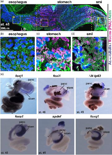 The Xenopus foregut mucociliary epithelium. (aâd) Confocal micrographs of immunostained inner epithelial lining of the Xenopus stage (st.) 45 esophagus, stomach and anterior small intestine (smi). Multiciliated cells are stained for acetylatedâαâtubulin (Ac.âαâtubulin, blue), mucus secretory cells are stained for mucins (PNA, magenta), and cell borders are stained with Phalloidin (actin, green). Magnified areas depicted in (bâd) are indicated by yellow boxes in (a). (e) Mucociliary marker gene expression revealed by in situ hybridization on isolated st. 45 guts. Panc, pancreas; stom, stomach. Image in (a) was reconstructed from multiple individual images