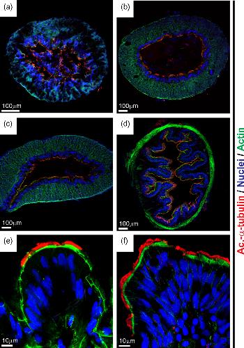Ciliation of the Xenopus stomach during metamorphosis. (aâf) Confocal micrographs of cryosectioned and immunostained Xenopus stomach samples at (a) stage (st.) 51, (b) st. 56, (c) st. 61, and (d) st. 65 reveal ciliation of the stomach lining throughout metamorphosis. (e,f) Magnified views on tips of gastric folds at (e) st. 63 and (f) st. 65. Samples were stained for acetylatedâαâtubulin (Ac.âαâtubulin, red), cell borders/the epithelium are stained with Phalloidin (actin, green), and nuclei were stained with DAPI (blue)