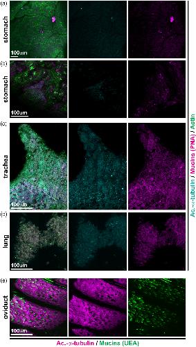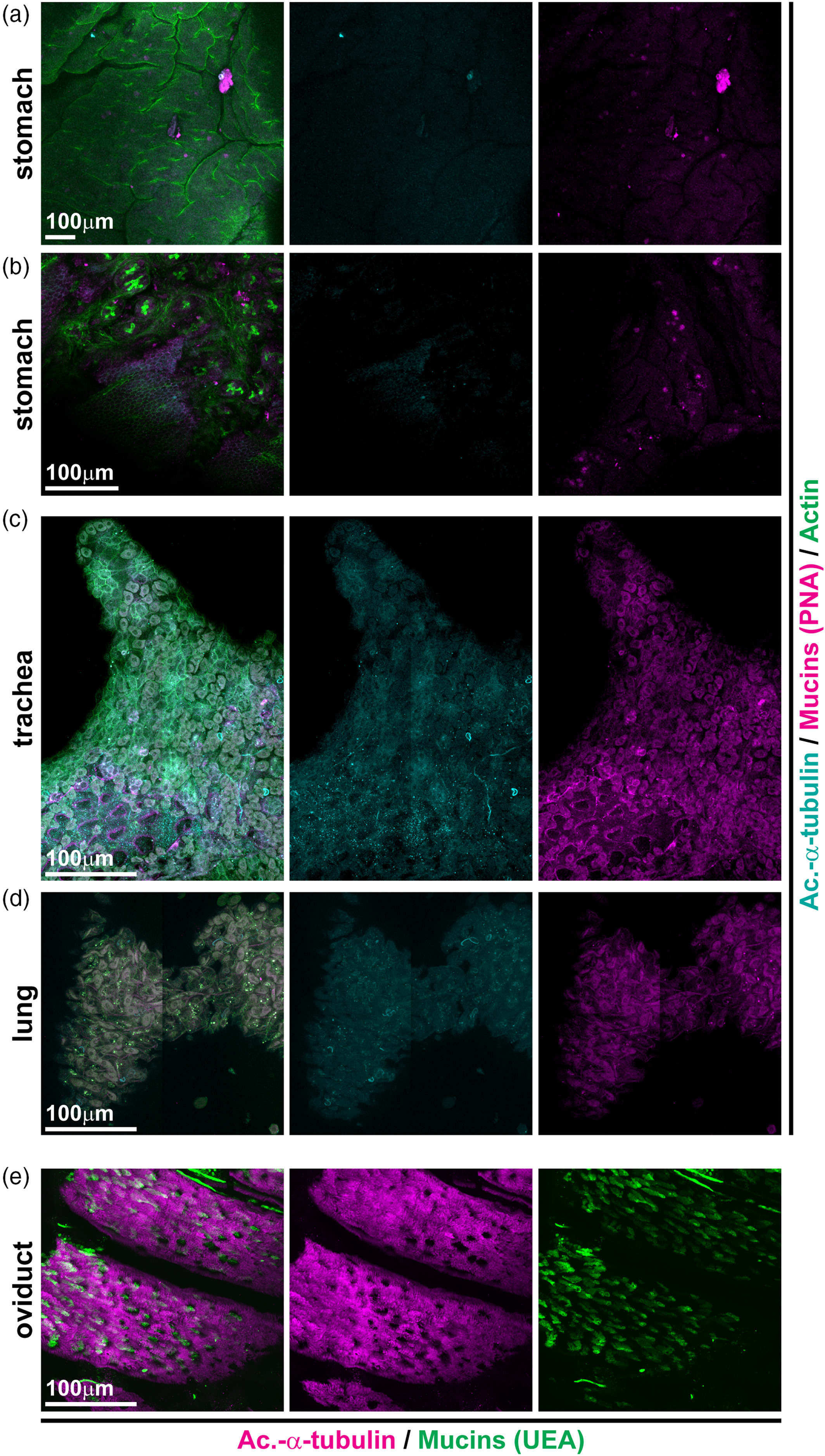 Analysis of ciliation in adult Xenopus tissues. (aâd) Confocal micrographs of immunostained adult Xenopus tissues. (aâd) Micrographs of (a,b) adult stomach samples, (c) the adult trachea, and (d) the adult lung stained for cilia (Ac.âαâtubulin, cyan), mucins (PNA, magenta), and Fâactin (actin, green) reveal lack of multiciliated cells (MCCs) in these tissues. (e) Micrographs of adult oviduct sample stained for cilia (Ac.âαâtubulin, magenta) and mucins (UEA, green) reveal a densely ciliated epithelium populated predominantly by MCCs with mucus secretory cells being interspersed. Images in (câe) were reconstructed from multiple individual images